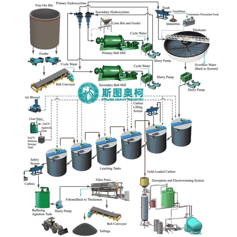 The Cyanide-in-Pulp (CIP) and Cyanide-in-Leach (CIL) production lines are gold extraction processes based on the adsorption principle of activated carbon. The core process involves preparing a pulp from crushed and ground gold ore, leaching it in a cyanide solution to dissolve the gold into a gold-cyanide complex. Subsequently, activated carbon adsorbs this complex to achieve gold enrichment and separation.